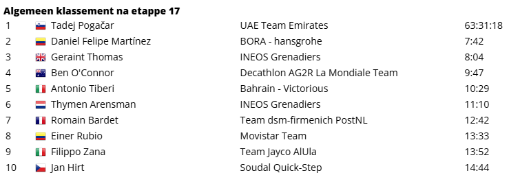 Laatste kilometers. De 22-jarige Steinhauser begon met een voorsprong van 2.30 minuut op de groep-Pogačar aan de Passo Brocon (12,2 km aan 6,4%). Daartussen zwom Ghebreigzabhier nog op 40 seconden van de koploper, maar de Eritreeër viel stil. Of beter gezegd: Steinhauser reed stevig door. Zijn voorsprong op de favorietengroep liep zo op tot meer dan drie minuten, waardoor de ritzege veiliggesteld was. Voor Steinhauser, debutant in een grote ronde, was het zijn eerste profzege uit zijn carrière. Pogačar was ondertussen een klasse apart. Hij werd tweede in de rit en zag Tiberi 15 seconden later naar de derde plaats sprinten. Arensman verloor uiteindelijk iets meer dan 10 seconden op de groep-Thomas. O’Connor hield de schade redelijk beperkt ten opzichte van zijn directe concurrenten in het klassement.