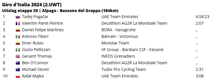 Op de top van de Monte Grappa had Pogacar een voorsprong van bijna twee minuten op de eerste achtervolgers: Martínez, Rubio, Tiberi en Pellizzari, die nog als tweede boven wist te komen. Het kwartet Thomas, Storer, O’Connor en Valentin Paret-Peintre volgde door het werk van laatstgenoemde niet veel later. In de afdaling had Pocagar alle tijd om uiteindelijk te zegevieren. Hij boekte zijn zesde ritzege van deze ronde en breidde zijn voorsprong in het algemeen klassement nog wat verder uit.