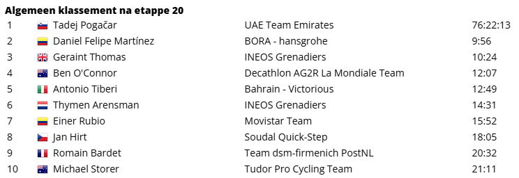 De laatste bergrit in de Ronde van Italië is een prooi geworden voor Tadej Pogacar. De rozetruidrager reed op de laatste beklimming van de Monte Grappa weg bij de andere klassementsrenners en boekte zo zijn zesde ritoverwinning van deze Giro. Valentin Paret-Peintre werd tweede, Daniel Felipe Martínez derde. De klassementsrenners moesten op de zaterdag voor Rome nog één keer flink aan de bak in de Giro d’Italia. De twintigste rit telde namelijk 4.200 hoogtemeters en bevatte een tweevoudige passage over de gevreesde Monte Grappa (18.1 km à 8.1%). De finish lag na 184km beneden, in Bassano del Grappa.