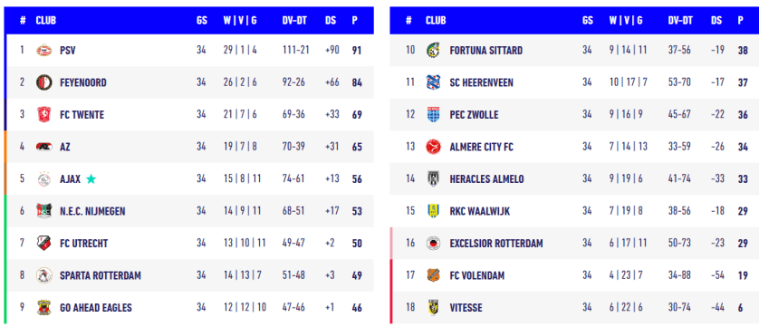 EINDSTAND EREDIVISIE 2023-2024
