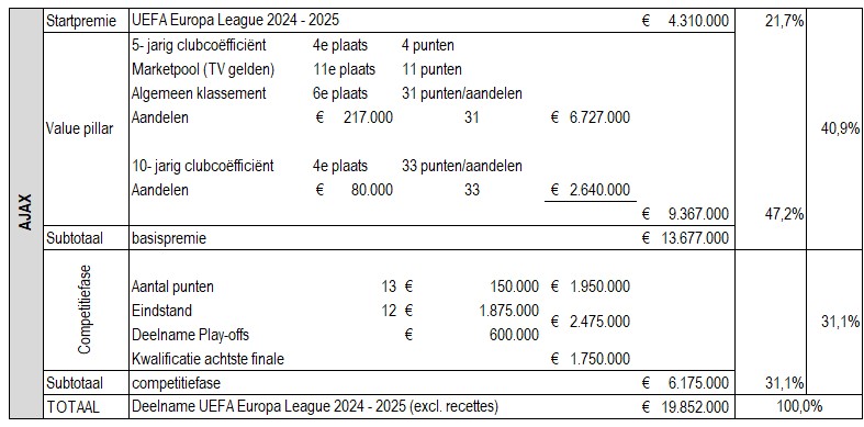 Europa League financieel. De plaatsing voor de competitiefase van de Europa League levert Ajax een deelnamepremie op van € 13,675 miljoen en omvat een startpremie van € 4,310 miljoen en een ‘marktwaardepremie’ (5- en 10- jarig clubcoëfficiënt, marketpool/tv-gelden) van € 9,365 miljoen. Ajax werd twaalfde in de competitiefase en plaatste zich daardoor voor de play-offs € 2,475 miljoen, waarin vier keer werd gewonnen en een keer gelijk gespeeld € 1,950 miljoen; totaal prestatiepremie € 4,425 miljoen. De deelname- en prestatiepremie samen maakt een bedrag van € 18,102 miljoen. Met het behalen van de achtste finales en vervolgens uitschakeling komt het eindbedrag op € 19,852 miljoen.