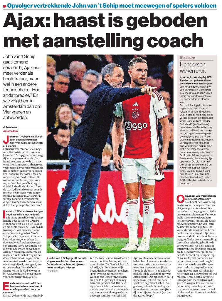 John van ’t Schip, 15 maart 2024. Ahmetcan Kaplan moest het veld donderdagavond vroegtijdig verlaten wegens klachten. “Wat ik van de dokter begreep gaat het nu redelijk met hem. Er is een kans dat hij er zondag bij is.” Josip Šutalo viel ook uit, “dat moeten we even bekijken.” Steven Bergwijn maakt volgens Van ’t Schip goede progressie. “Als alles zo doorgaat is hij er zondag hopelijk bij. Maar hij gaat sowieso geen negentig minuten spelen. De kans is wel klein dat Steven Berghuis erbij is tegen Sparta.”