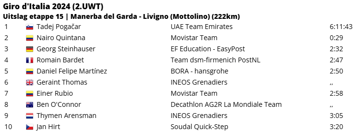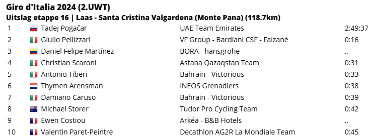 Laatste kilometers. Pogacar reed in een mum van tijd voorbij Costiou en Scaroni en ook de arme Pellizzari moest er aan geloven. Die laatste kreeg in de slotkilometer gezelschap van de Sloveen, probeerde nog even aan te pikken, maar moest dit al snel bekopen. Pogacar reed vrij gemakkelijk naar een nieuwe ritzege, zijn vijfde alweer in deze Giro. De 25-jarige coureur wist zo ook zijn al riante positie in het algemeen klassement nog verder te verstevigen. Na Pellizzari kwam Daniel Felipe Martínez als derde over de streep.