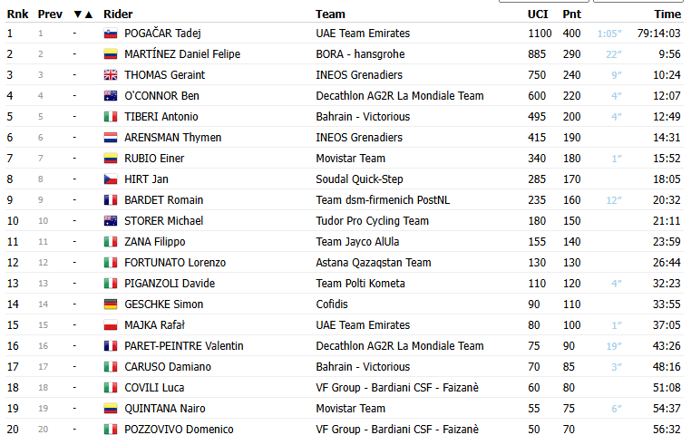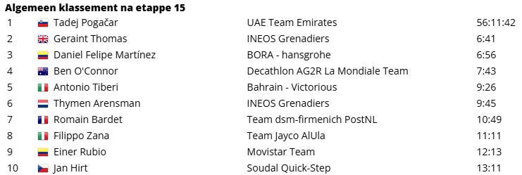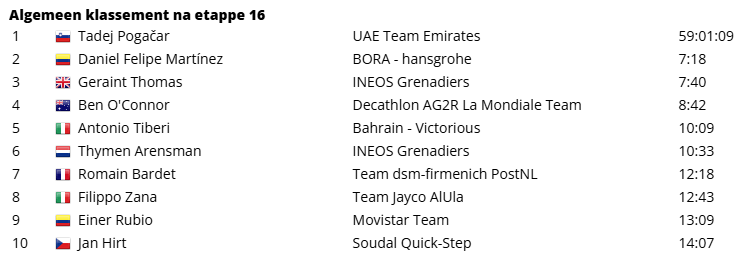Van de renners uit de favorietengroep kwam Romain Bardet over de streep. Daarachter vormde zich een groepje van vier. Thymen Arensman was hier belangrijk voor Thomas, die in de slotkilometer nog probeerde om Martínez en O’Connor eraf te krijgen. O’Connor, die het eerder ook al moeilijk had, ging inderdaad overboord. Maar Martínez had nog wel wat in de tank. Ze kwamen zo samen op bijna drie minuten van Pogacar over de streep.