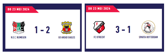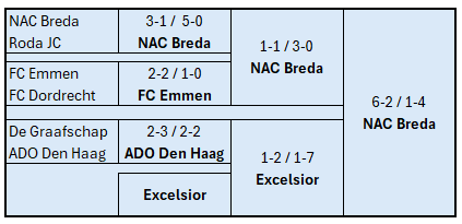 [25-05-2024] Excelsior Rotterdam en NAC Breda spelen de finale op 28 mei en 2 juni 2024. Excelsior speelt voor handhaving in de Eredivisie. NAC, eerst thuis, speelt voor promotie naar de Eredivisie, waarbij Excelsior degradeert naar de Eerste Divisie.