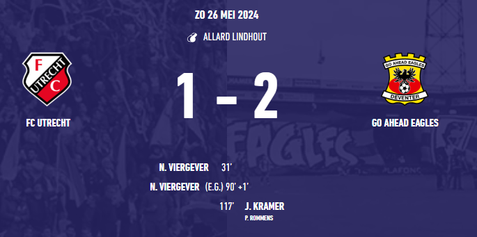 In een bloedstollende finale met een uiterst chaotische ontknoping heeft Go Ahead Eagles het laatste Europese ticket in Nederland veroverd. FC Utrecht leek in de finale van de play-offs hard op weg naar een 1-0 zege in de reguliere speeltijd, maar na een noodzakelijke staking ging alles mis voor de thuisploeg. Eerst maakte Nick Viergever een eigen goal en in de ultieme slotfase van de verlenging bezorgde Joris Kramer de ploeg van René Hake het Europese ticket. Go Ahead Eagles heeft zich geplaatst voor de tweede voorronde van de UEFA Conference League 2024-2025.