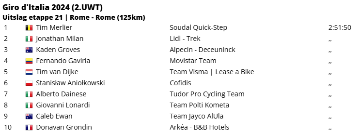 Tim Merlier is als winnaar over de streep gekomen in de 21ste en laatste etappe van de Giro d’Italia 2024. De Belg van Soudal Quick-Step zegevierde na een bijzonder hectische sprint in Rome. Jonathan Milan moest in de finale afrekenen kreeg een lekke band. Milan werd na zijn wonderbaarlijke remonte op sleeptouw genomen door zijn ploeggenoten van Lidl-Trek. De Amerikaanse ploeg wist – niet voor het eerst in deze Giro – een perfecte lead-out op poten te zetten. Althans, zo leek het toch. Na een enorme kopbeurt van Stuyven ontstond er echter wat twijfel en hierdoor raakte Milan ietwat. pakken. Van de ontstane chaos wist Merlier optimaal van te profiteren. Milan werd tweede.