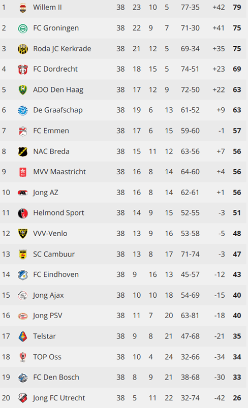 [10-05-2024] FC Groningen keert terug naar de Eredivisie. In een onderling duel met directe concurrent Roda JC was de Trots van het Noorden een maatje te groot, uitslag 2-0. FC Groningen en Roda JC behaalde evenveel punten (75 punten), maar FC Groningen heeft een beter doelsaldo (+6). Willem II (79 punten) promoveerde al eerder naar de Eredivisie en is kampioen van de Eerste Divisie 2023-2024.