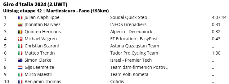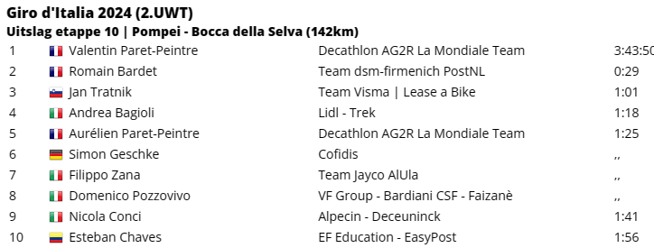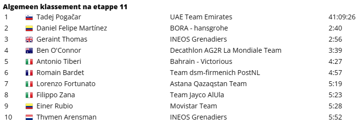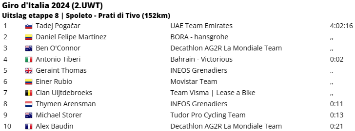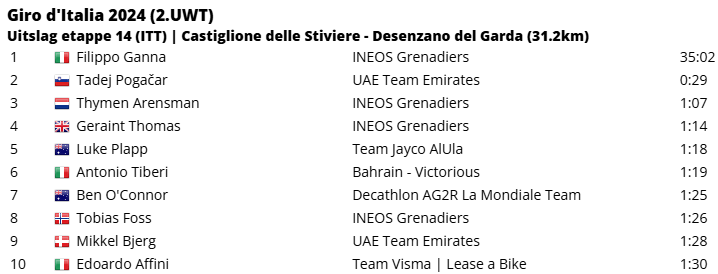 Dan was het alleen nog uitkijken naar de top 10 van het algemeen klassement. Enerzijds om te zien hoe zij zich onderling ten opzichte van elkaar zouden verhouden, maar vooral ook of iemand van hen een rol zou kunnen spelen voor de dagzege. Vooral Thymen Arensman (INEOS Grenadiers) – die na een mindere start maar blijft groeien in deze Giro d’Italia – deed daarbij een gouden zaak. Ook ploegmaat Geraint Thomas, Antonio Tiberi (Bahrain Victorious) en zelfs Ben O’Connor (Decathlon AG2R) deden het goed. Maar ze kwamen allemaal binnen de twintig seconden van elkaar binnen, waardoor de grote verschuivingen uitbleven.