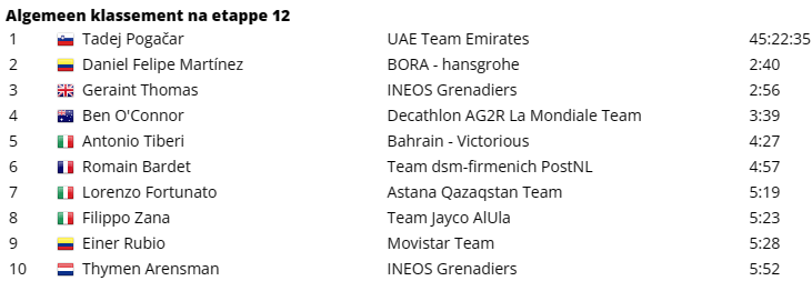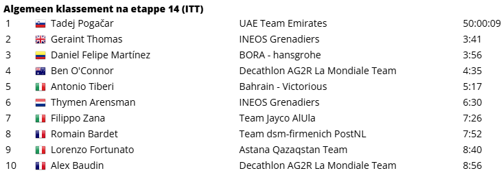 Op papier deed Daniel Felipe Martinez (BORA-hansgrohe) de ‘slechtste’ zaak van de top 5, maar hij kon het verlies beperken tot een kleine halve minuut op Geraint Thomas. Maar dan moest de rozetruidrager Tadej Pogacar nog passeren. Pogacar begon opvallend doorgedreven aan zijn tijdrit en verraste vriend en vijand door aan het eerste tussenpunt zelfs vier seconden sneller dan Ganna af te klokken. Kon ‘Pogi’ het dan toch ook op het vlakke? Nee dus, want op punt twee had Ganna die achterstand omgebogen in tien seconden voorsprong. Aan het einde zat Pogacar door zijn beste krachten heen en moest hij 29 seconden op de Italiaanse dagwinnaar toegeven. Maar geen man overboord, want de leider doet opnieuw een gouden zaak. Hij neemt meer dan een halve minuut op zijn dichte concurrenten in het klassement en smeert mannen als Martinez zelfs een minuut en 16 seconden aan.