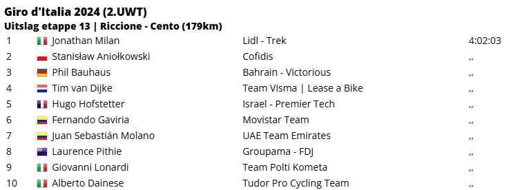 Jonathan Milan heeft de dertiende etappe van de Giro d’Italia gewonnen door de massasprint te winnen in Cento. Een biljartvlakke etappe, die werd opgeschrikt door waaiers, kende de ontknoping in de straten van Cento, waar een massasprint in de sterren stond geschreven. De Italiaan was de sterkste van de sprinters, nadat hij eerder in de rit in de problemen kwam tijdens de waaiervorming.