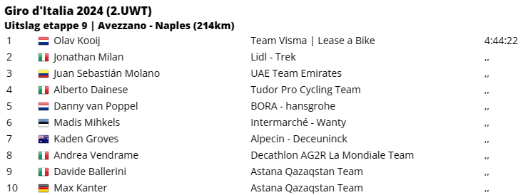 De eerste ritzege van Olav Kooij in een grote ronde is een feit. De Nederlander van Visma | Lease a Bike snelde in Napels naar de overwinning. Jhonathan Narváez leek na een aanval op de laatste klim op weg naar zijn tweede ritzege, maar werd in de laatste honderd meter toch nog voorbijgesneld door de spurters.