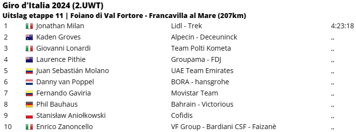 Jonathan Milan heeft de elfde etappe van de Giro d’Italia 2024 gewonnen, na een sprintduel met Tim Merlier. De Italiaan van Lidl-Trek wachtte in de massasprint op het juiste moment en wist met een stevige sprint Merlier nog te passeren. Uiteindelijk werd Kaden Groves tweede en niet Merlier, omdat de Belg een gevaarlijke manoeuvre maakte in de sprint.