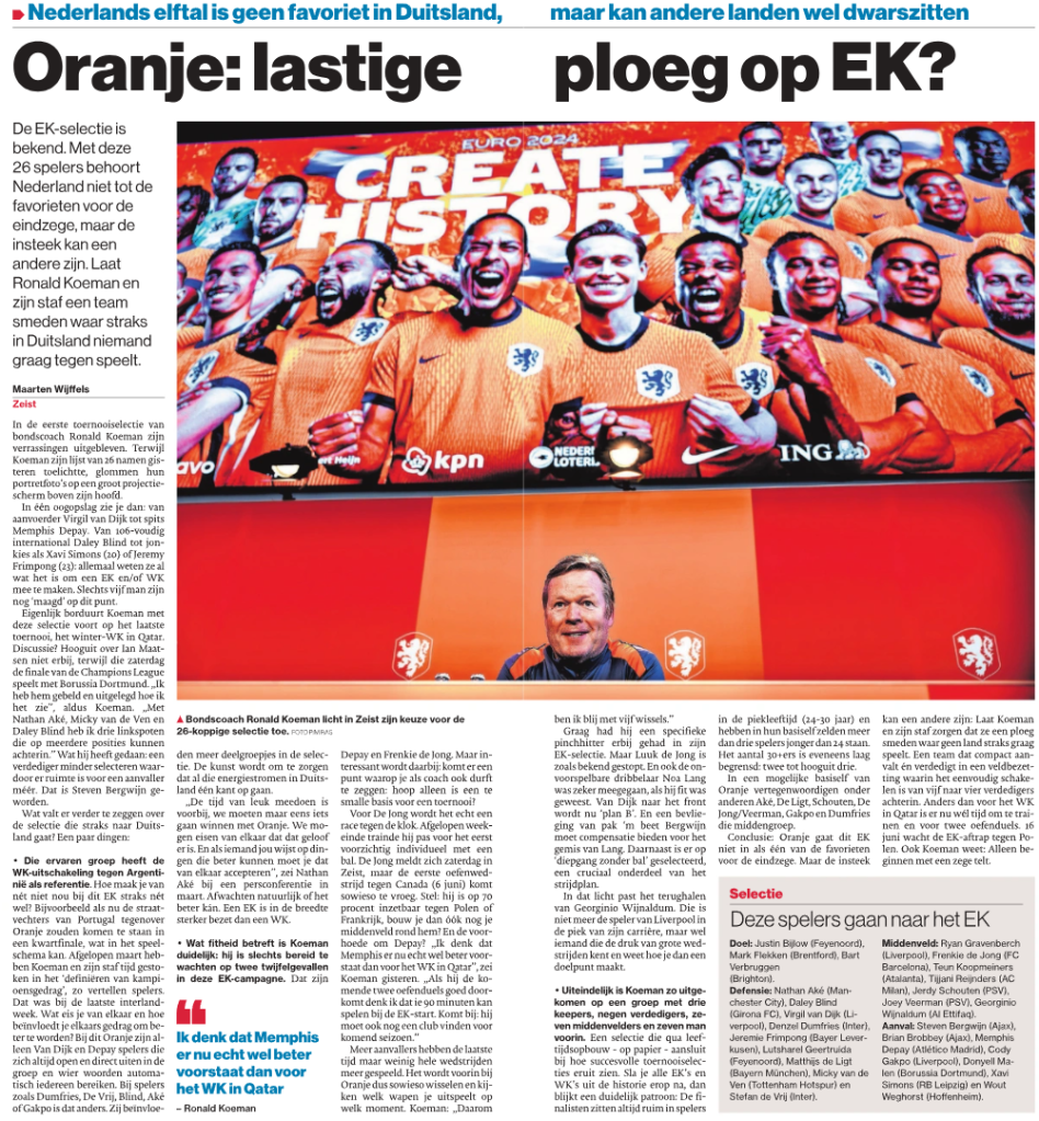 Ronald Koeman maakte vandaag, woensdag 29 mei, zijn definitieve selectie bekend voor het EURO2024 in Duitsland. Al eerder was bekend dat Marten de Roon niet op tijd fit zal zijn voor het eindtoernooi. Daarnaast heeft bondcoach Ronald Koeman niet opgenomen in de definitieve EK- selectie: Quinten Timber, Ian Maatsen en keeper Nick Olij.