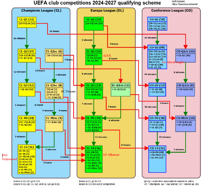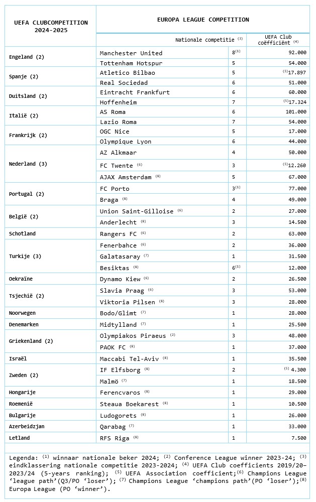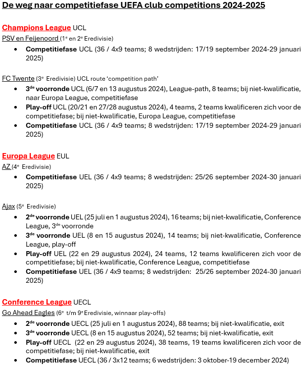 AZ Alkmaar heeft zich direct gekwalificeerd voor de competitiefase van de UEFA Europa League 2024-2025. Ajax Amsterdam stroomt in bij de tweede voorronde. Als Ajax de competitiefase van de UEFA Europa League wil bereiken, moet het in totaal drie voorrondes overleven. Het gaat om de tweede voorronde, de derde voorronde en de play-offs. Mocht AJAX worden uitgeschakeld in de tweede of derde voorronde dan gaat zij naar respectievelijk de derde voorronde of play-offs van de UEFA Conference League 2024-2025. AJAX gaat naar de competitiefase van de UEFA Conference League wanneer zij uitgeschakeld wordt in de play-offs van de UEFA Europa League. Ajax heeft zich geplaatst voor de competitiefase van de UEFA Clubcompetition Europa League 2024-2025 door achtereenvolgens te winnen van FK Vojvodina FK (2e), Panathinaikos (3e) en Jegiellonia Bialystok (play-off).