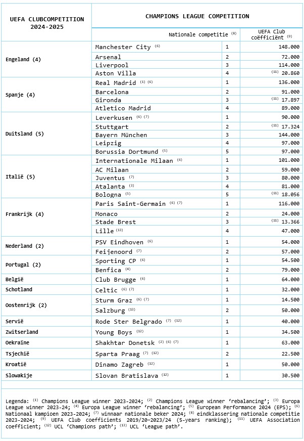 De opzet van de UEFA Champions League wijzigt aanzienlijk vanaf seizoen 2024-2025. De grootste verandering is de competitiefase (voorheen groepsfase), die een enkele competitie met 36 teams kent. Elke ploeg staat tegenover acht verschillende teams (vier thuis, vier uit). De top acht van het algemeen klassement gaat rechtstreeks door naar de 1/16- finale. Ploegen die eindigen op de 9de tot en met de 24e plaats strijden in de play-offs, waarvan de acht winnaars doorgaan naar de laatste zestien. Vanaf de 1/16- finale begint de knock-outfase.