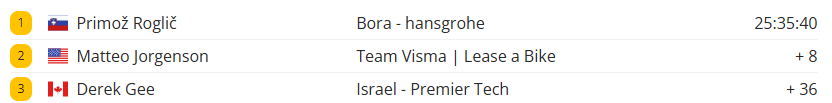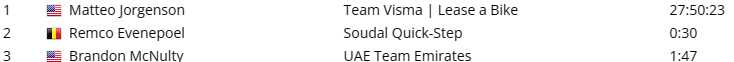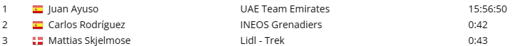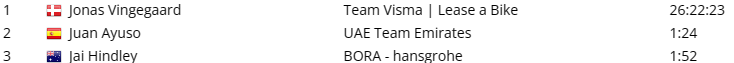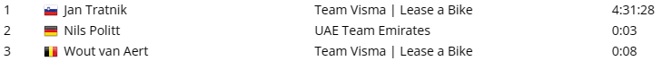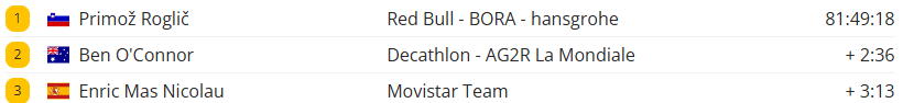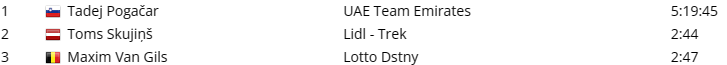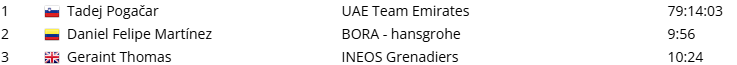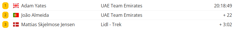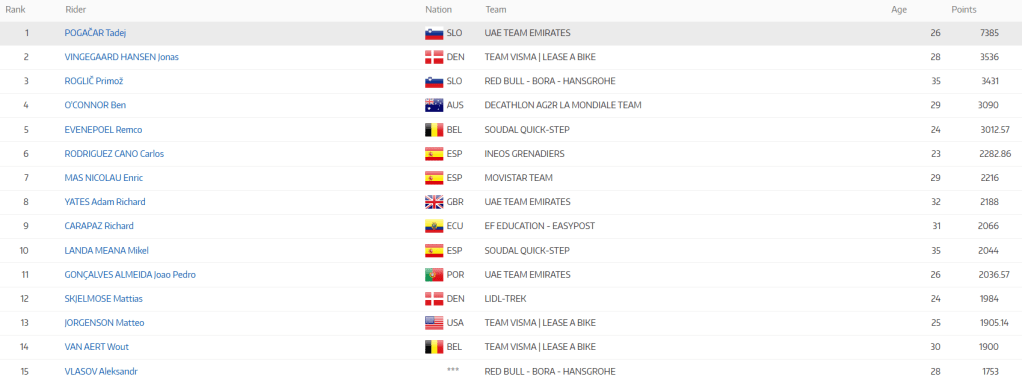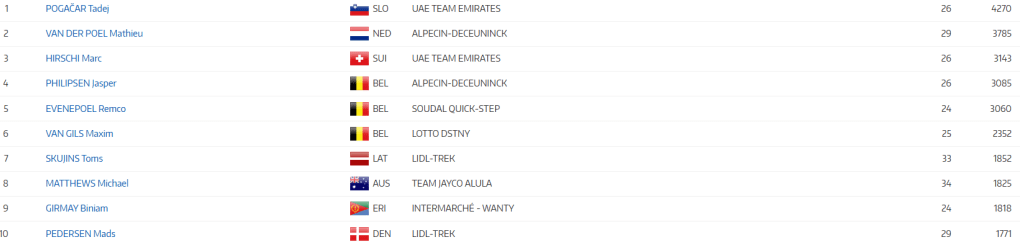 UAE Emirates, de ploeg van Tadej Pogacar, behaalde in totaal 37.410,6 punten. Daarmee eindigt het ver voor Visma | Lease a Bike (20.428 punten) en Soudal Quick-Step (18.154 punten), de nummers twee en drie.