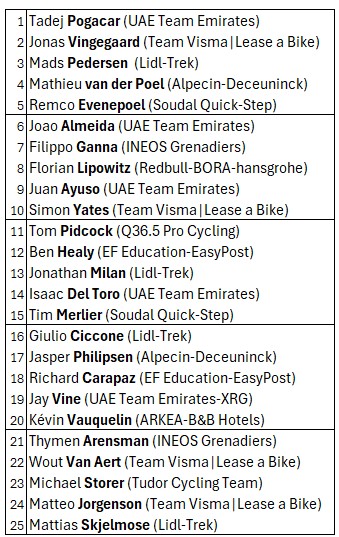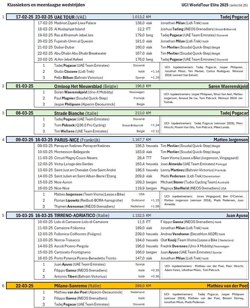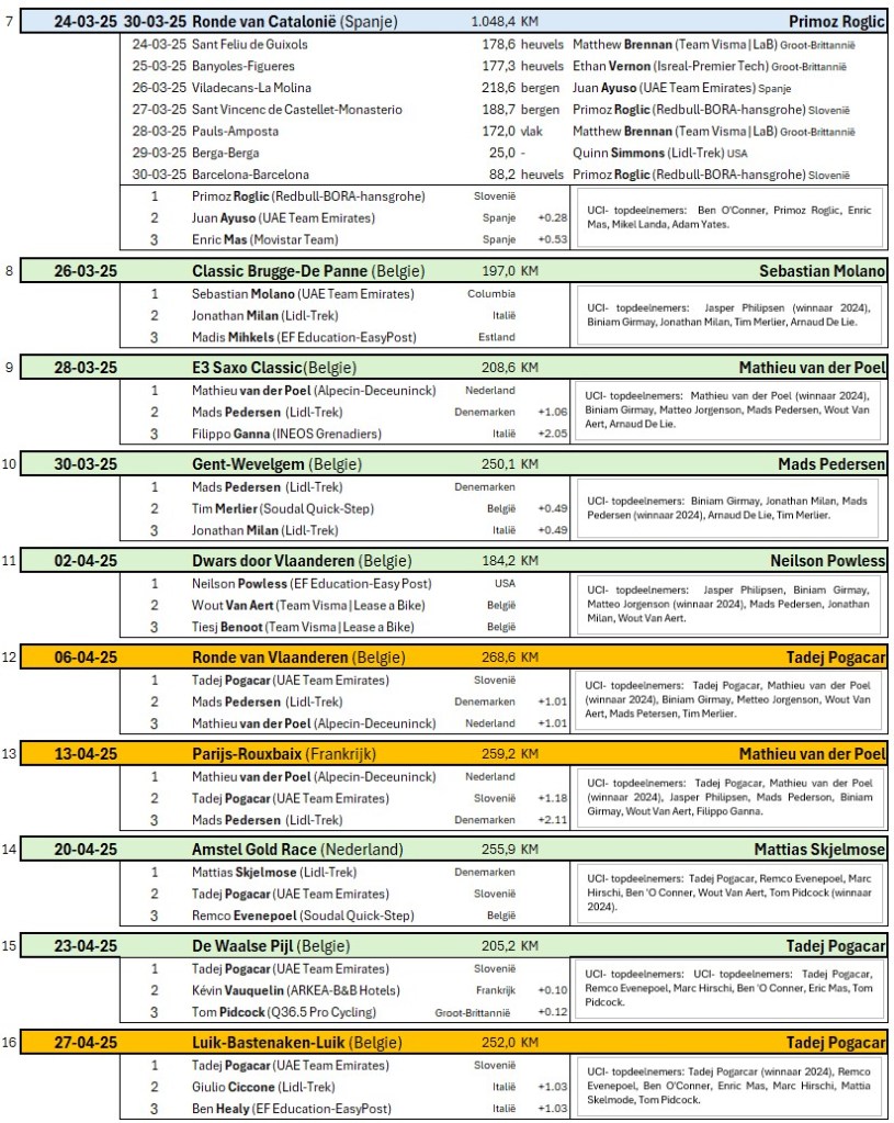 WIELRENNEN 2025 Milaan-San Remo RONDE VAN VLAANDEREN PARIJS-ROUBAix LUIK-bastenaken-LUIK GIRO D’Italia Tour de France VUELTA A ESPANA Ronde van lombardije Overzicht KOERSEN UCI World Klassement t/m 2025-50 25 PODIUMBEST 2025